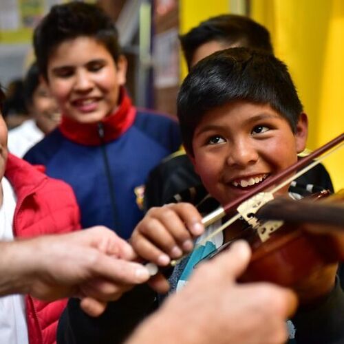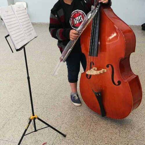 2024 - (2 of 5) The new Double Bass has a fantastic welcome by the INTA children's orchestra. This is one of five Double basses PIP has made grants to buy. All the funds for these came from a family bequest in Wales, made to provide more opportunities for children to learn the Double Bass, especially for those who could not afford an instrument of their own.
