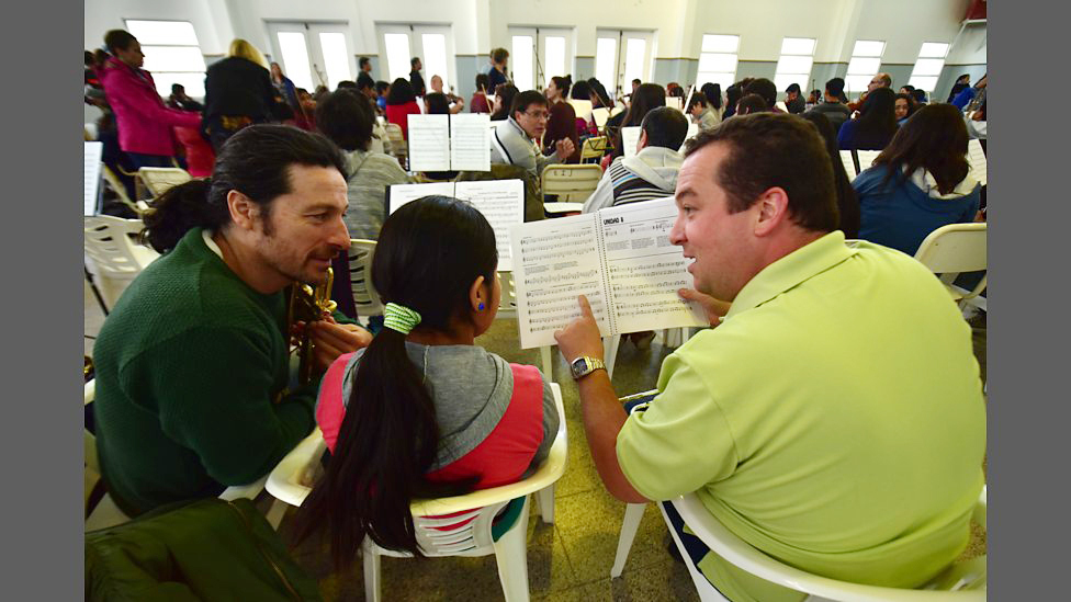 Rob from PIP works with a young brass player in Chubut during the 2015 BBC NOW tour of Argentina, to celebrate the 150th anniversary of the Welsh settlement, Y Wladfa, Chubut.