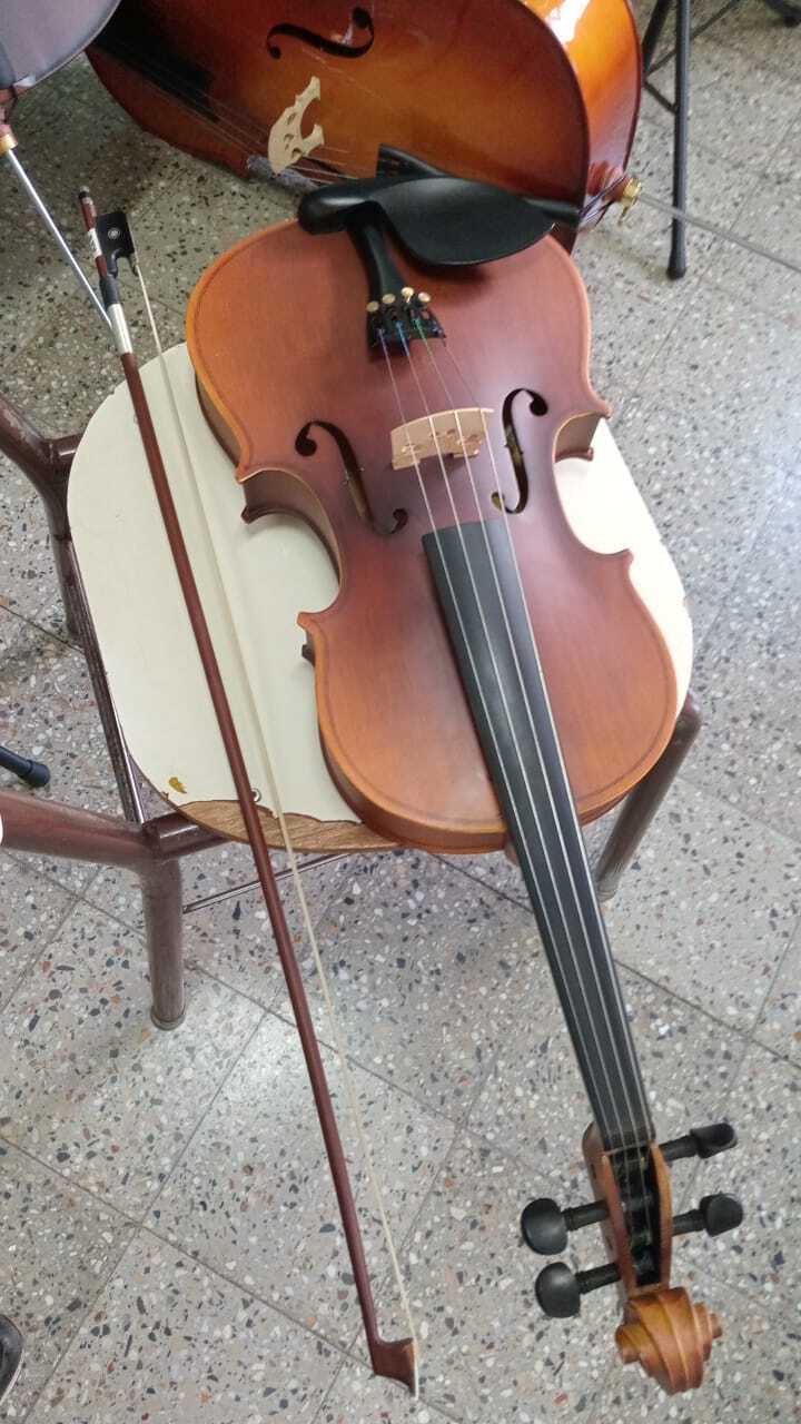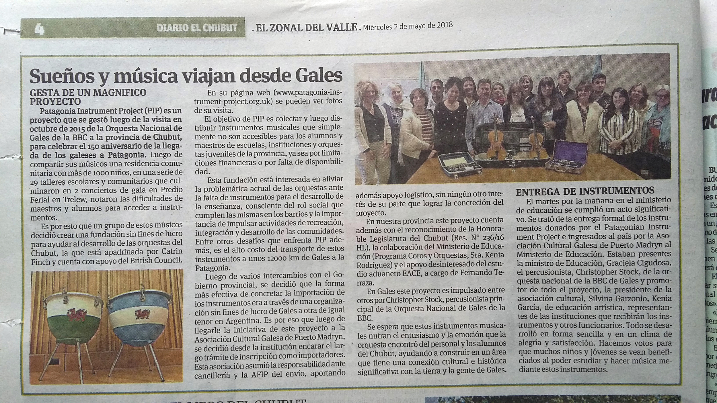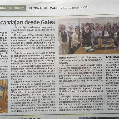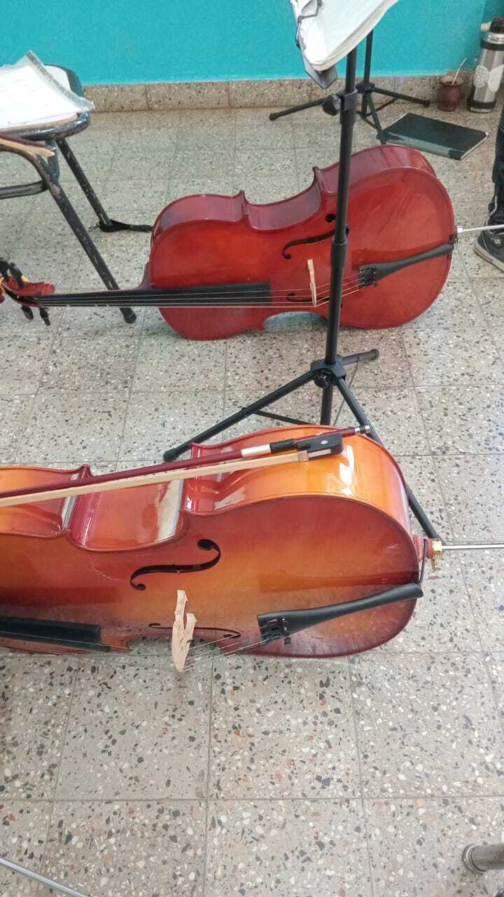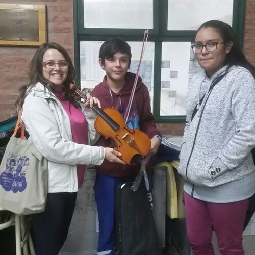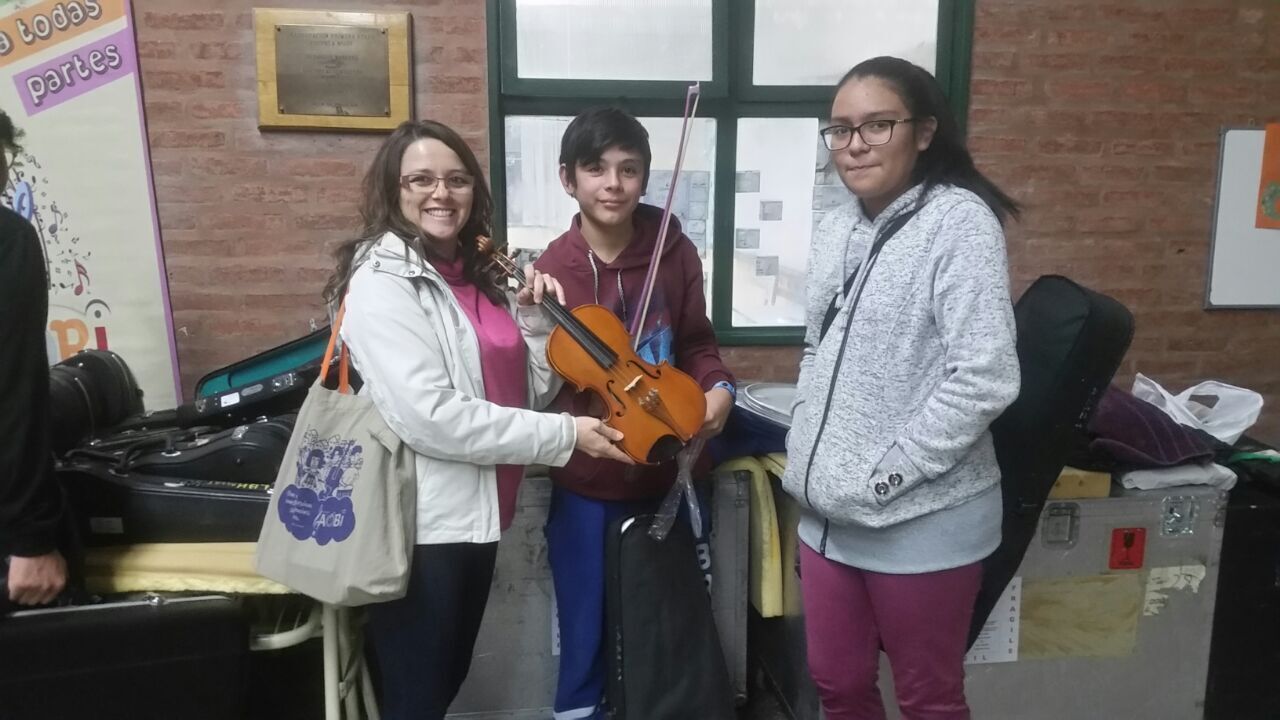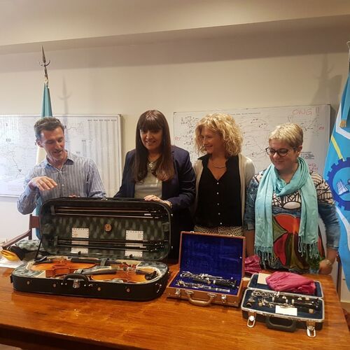 2018 - Two string instruments taken to the Ministry of Education in Chubut, as a symbolic donation, part of the official signing of the necessary documents to accept our shipment of 10 flight cases full of instruments.