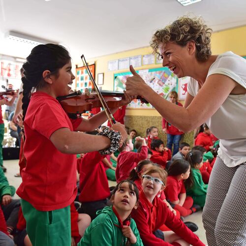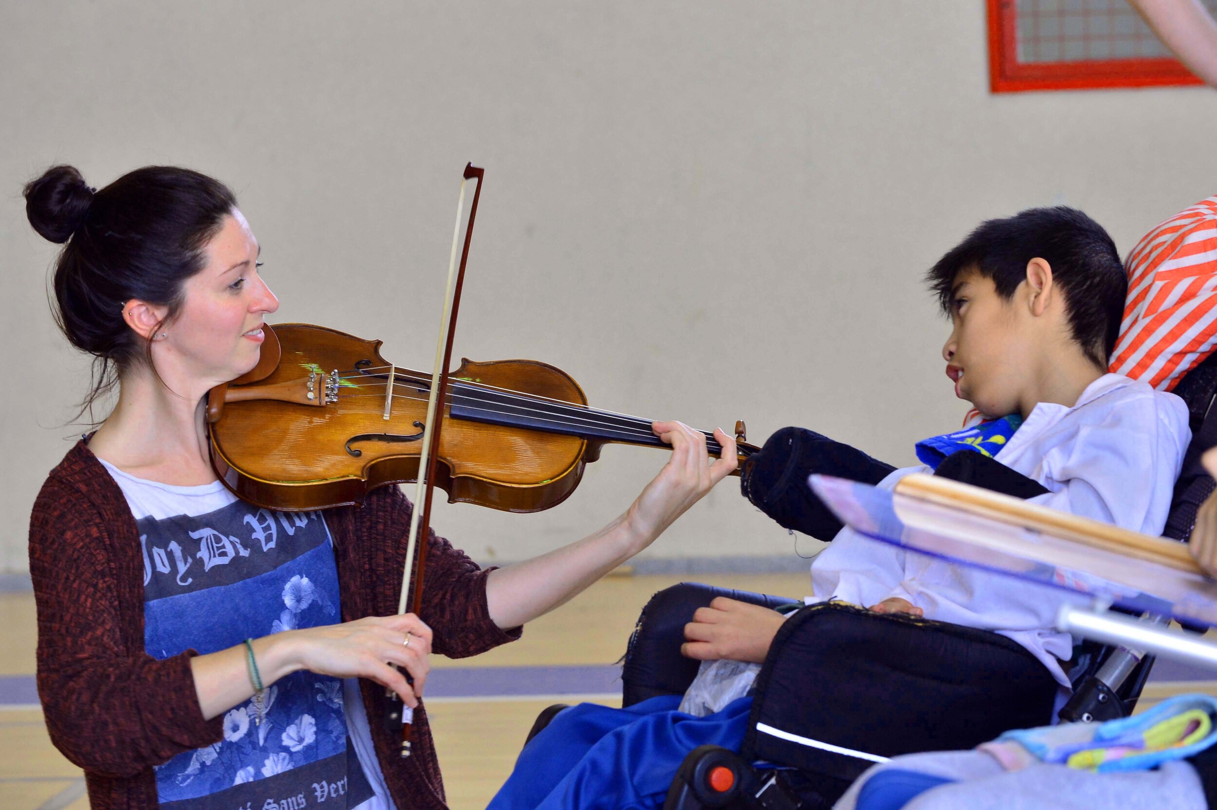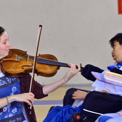 A viola from player from BBC NOW works with a child with disability in Chubut during the 2015 tour to celebrate the founding of Y Wladfa, the Welsh settlement in Chubut in 1865.
