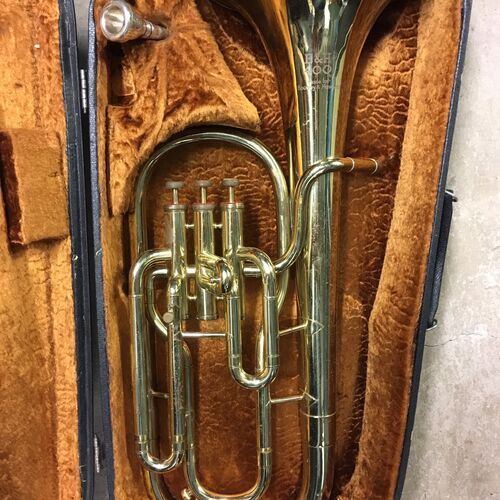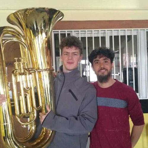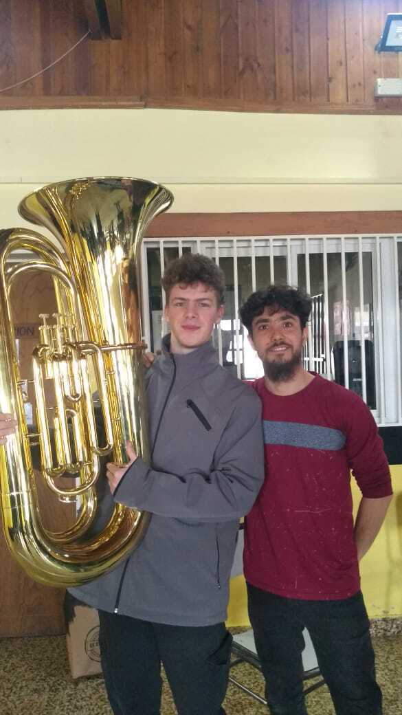 2024- Our latest purchase, for a new orchestra connection for us. The Orquesta Ayun Hueney in El Bolson. This 3-Valve Tuba will be used here, but also in the orchestras we support in El Hoyo and Epuyen. This purchase was made possible through your donations and continued support for our work. In the safe hands of its new player, as the orchestra conductor looks on.