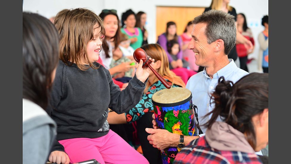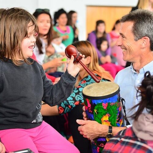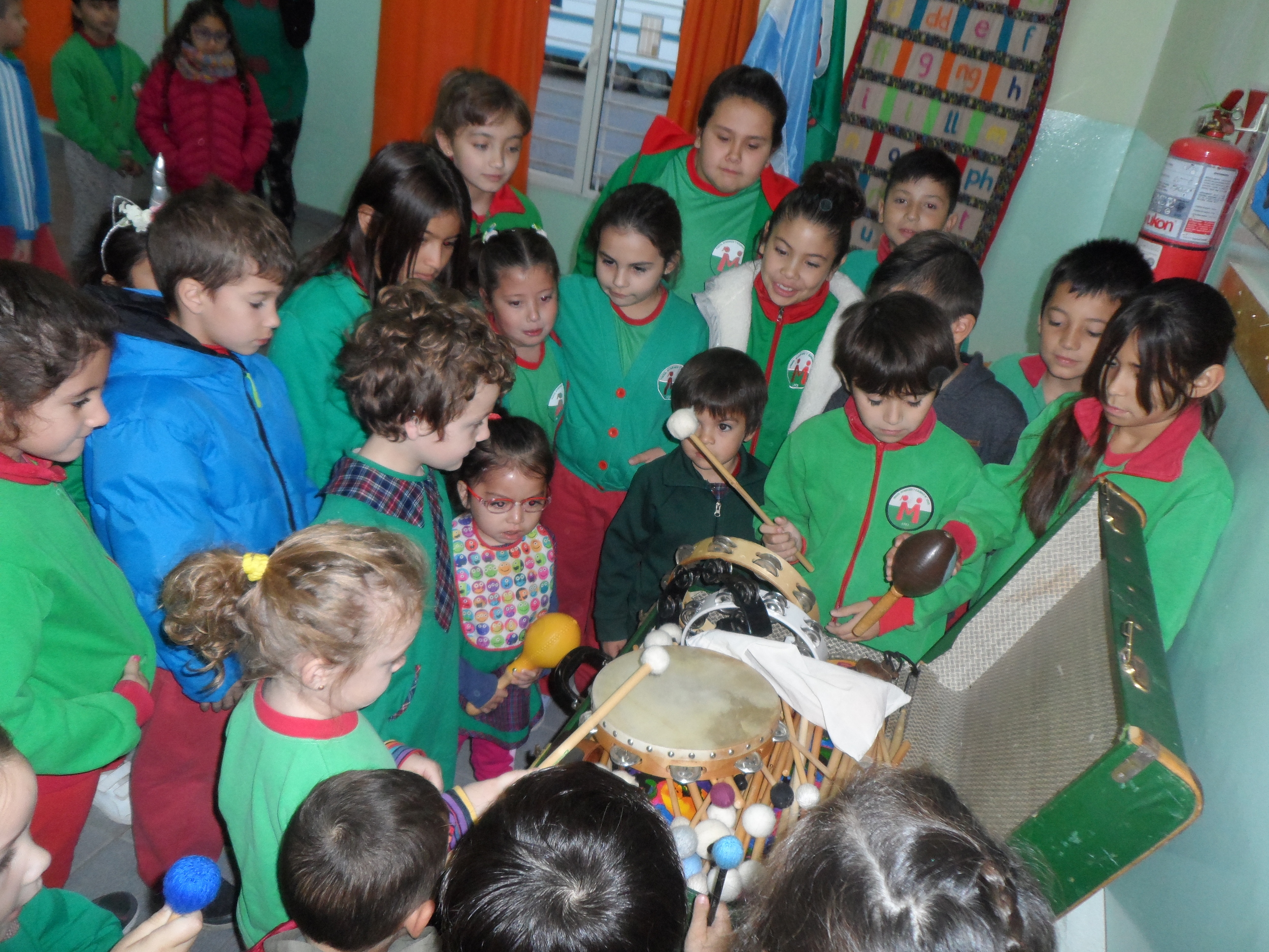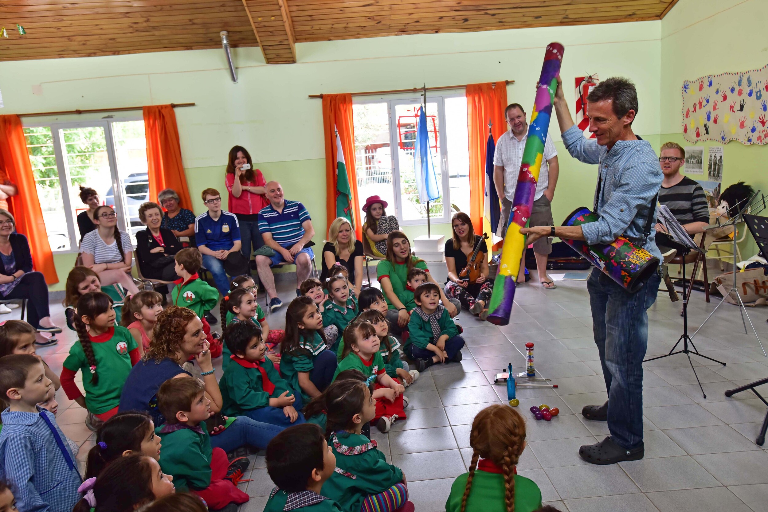 A class workshop in Gaiman bilingual school, with Chris Stock demonstrating some percussion instruments.