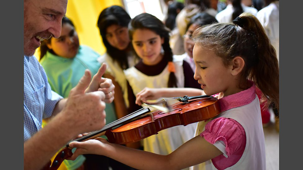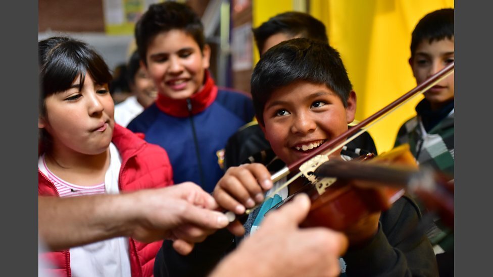 A viola from player from BBC NOW works with a child with disability in Chubut.