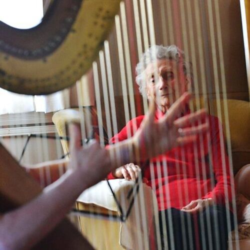 Part of the 2015 tour to Chubut to celebrate the 150th anniversary of Y Wladfa, was playing live music to older residents in their houses. Here the harp is being played to a Patagonian resident.
