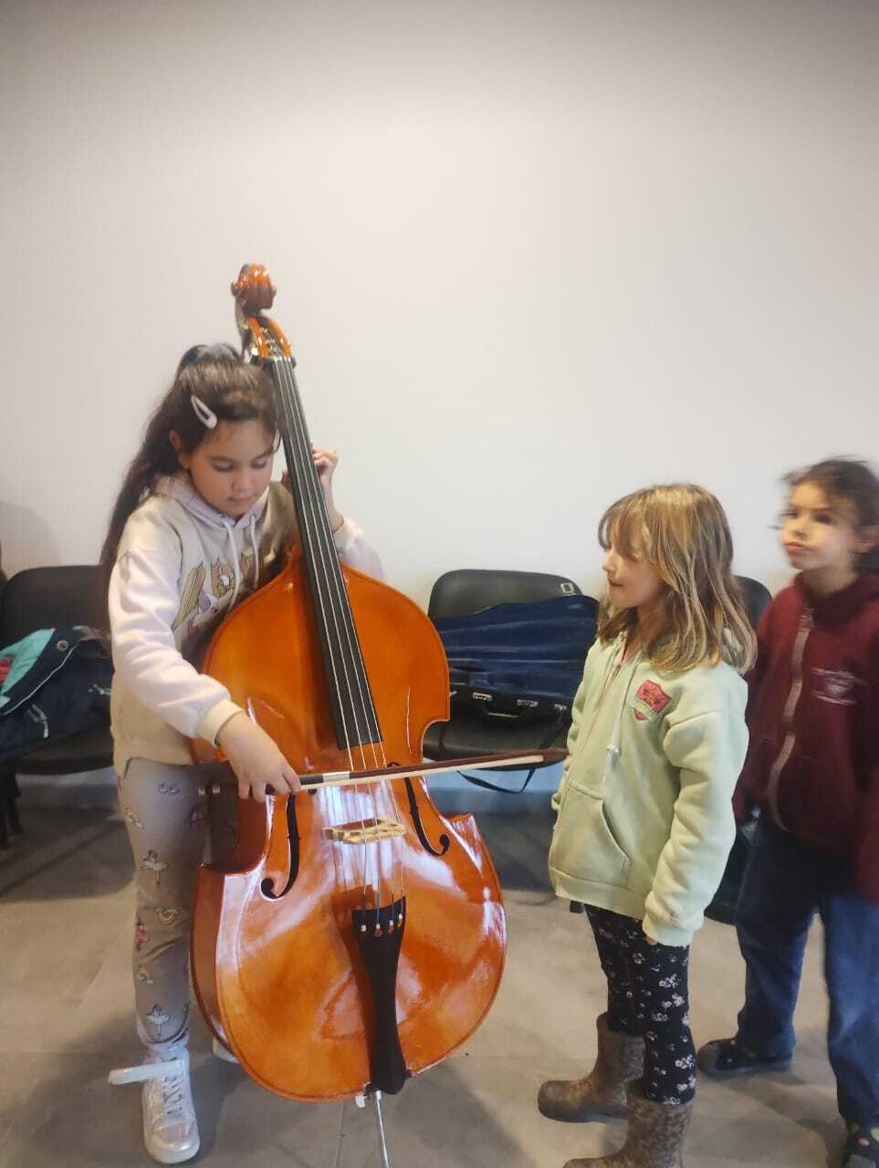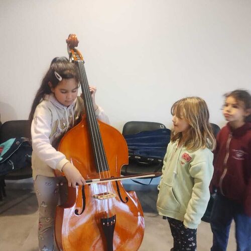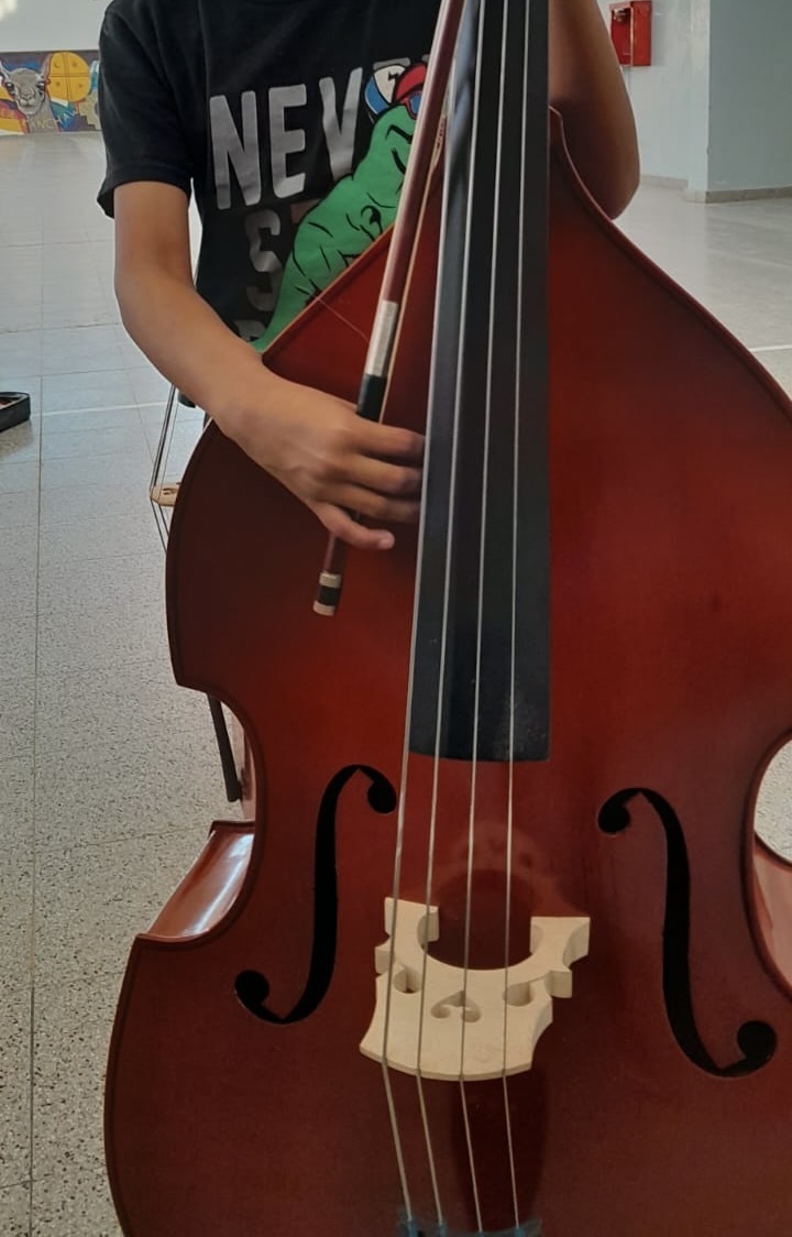 2024 - (4 of 5) Puerto Madryn Children's orchestra. The fifth new Double Bass that PIP has made grants to buy right across Chubut, from a family bequest in Wales. It was made to provide opportunities for children to learn the Double Bass, especially for those who could not afford an instrument of their own.