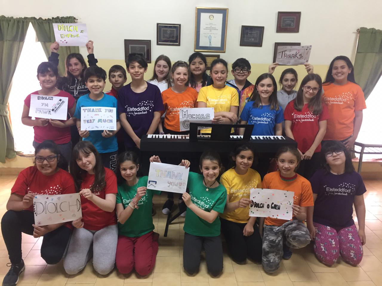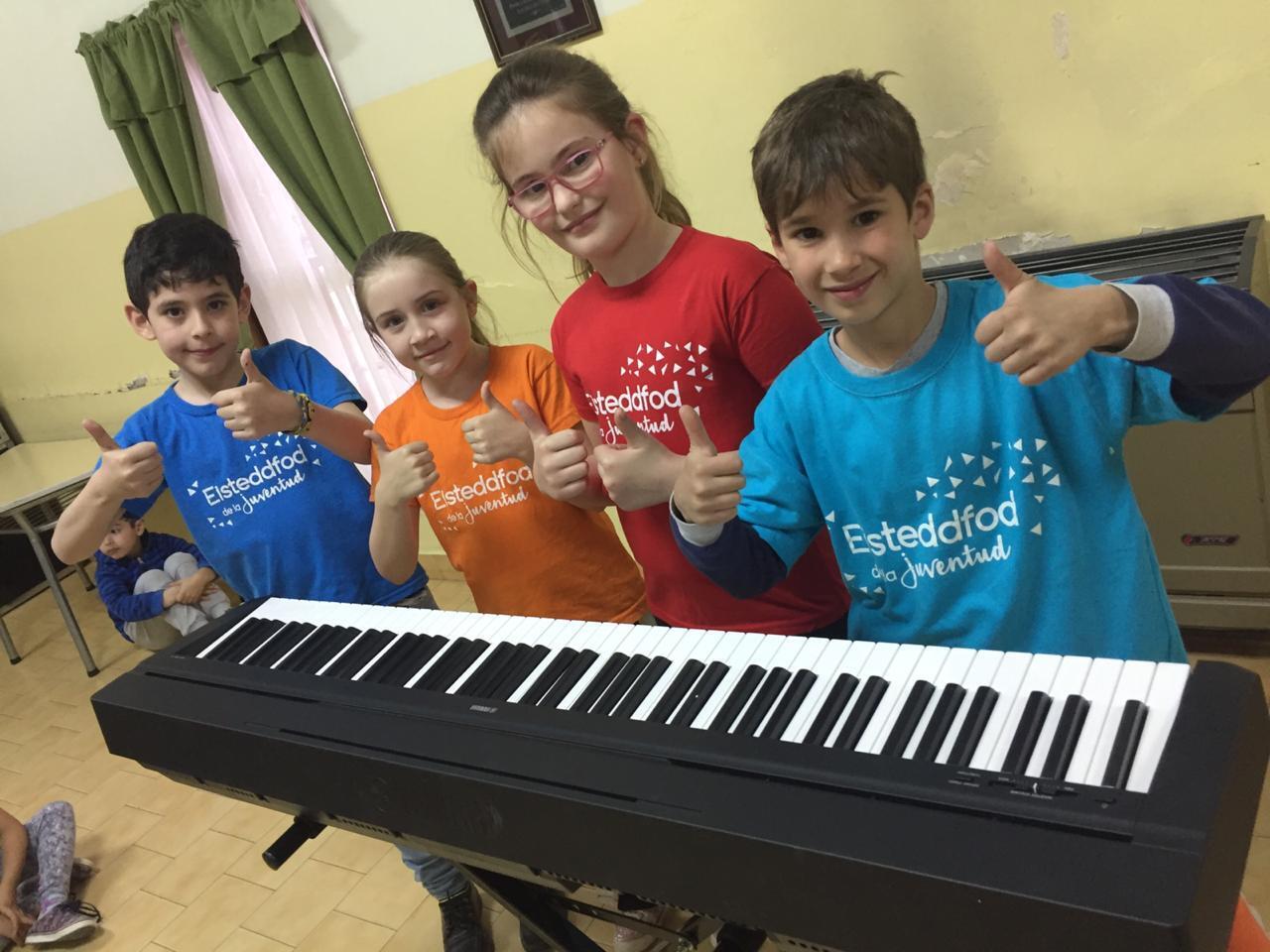 The eisteddfod hopefuls with the Yamaha digital piano bought by PIP, in Gaiman.