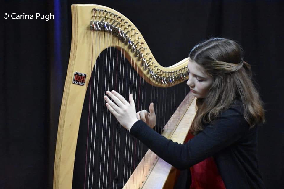 2019 - Helen playing a Teifi Harp in Gaiman. With your help, we donated three new sets of strings to keep this instrument in great condition for years to come, so many more students can learn on it.