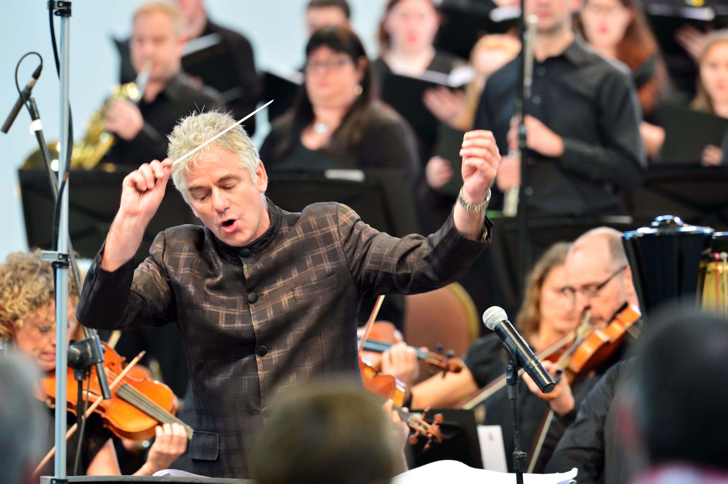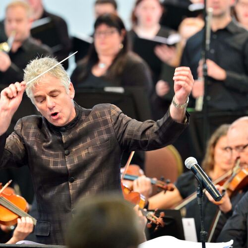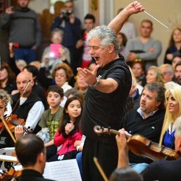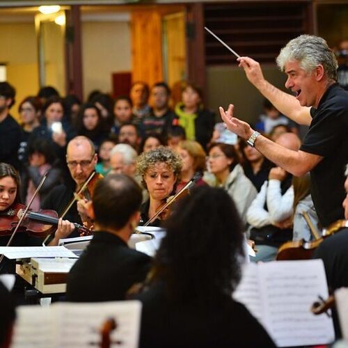 Grant LLewellyn conducts a concert of a side-by-side orchestra with players from BBC NOW and students from Chubut.