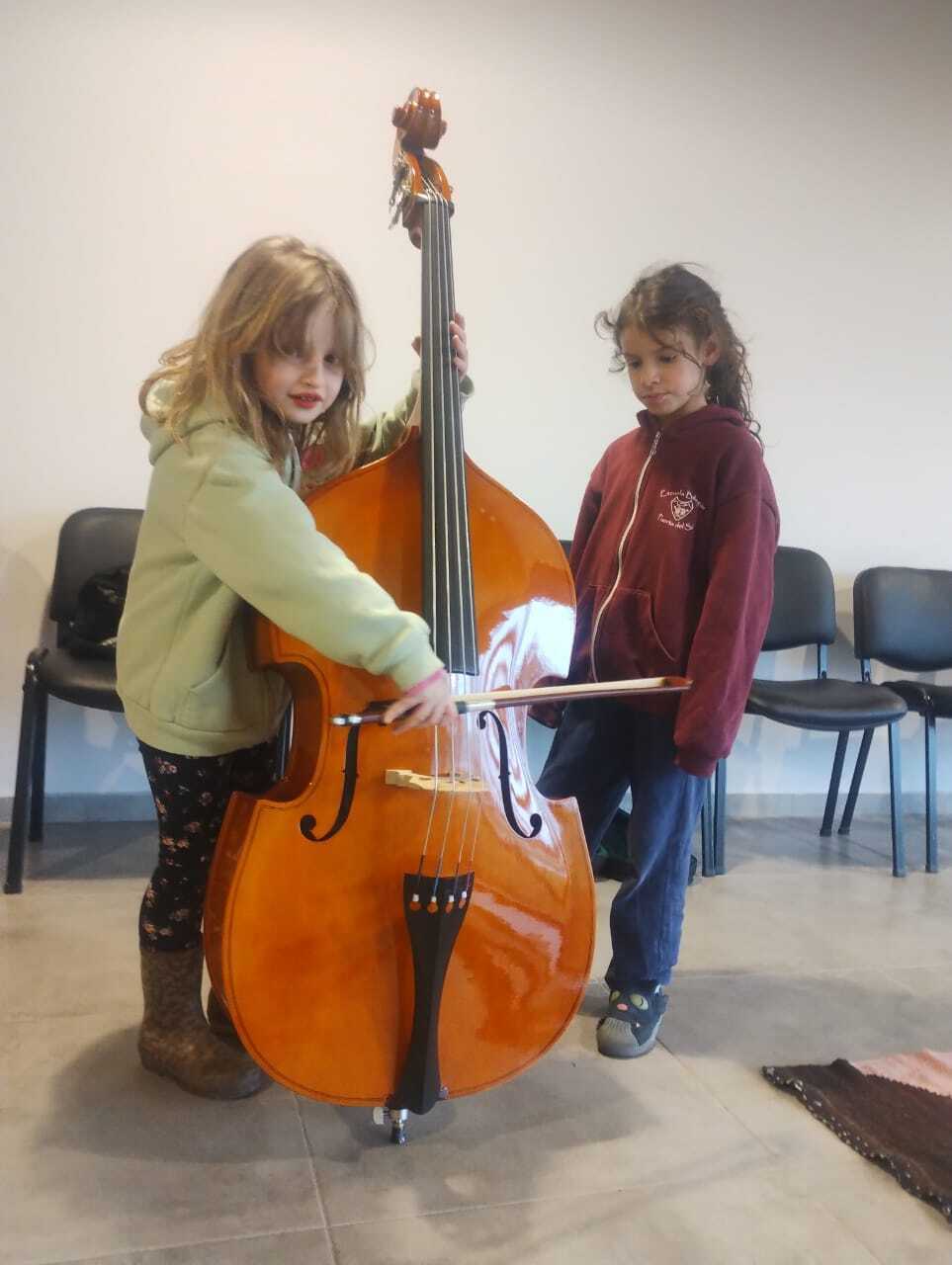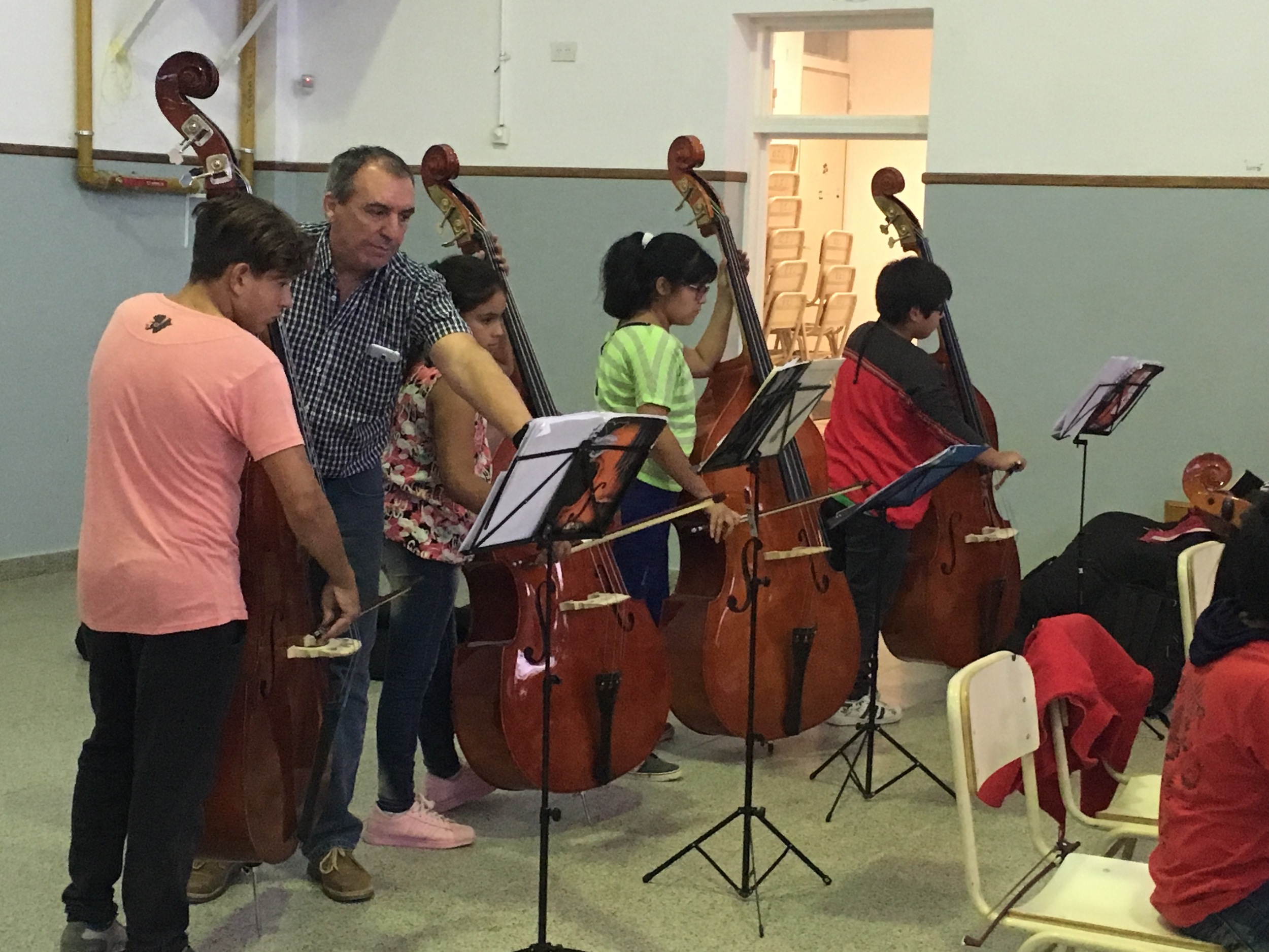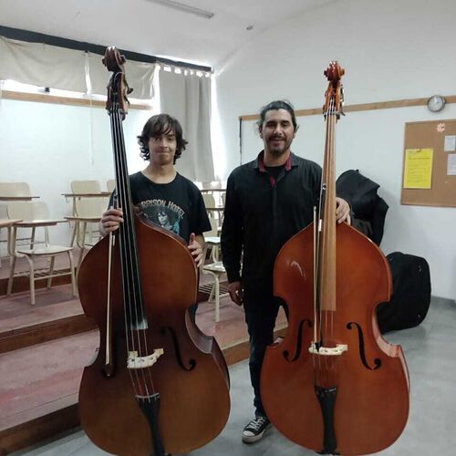 2024 - (3 of 5) The two new Double Basses at El Bolson children's orchestra. One of these, is one of the five Double basses PIP has made grants to buy from a family bequest in Wales. It was made to provide opportunities for children to learn the Double Bass, especially for those who could not afford an instrument of their own.