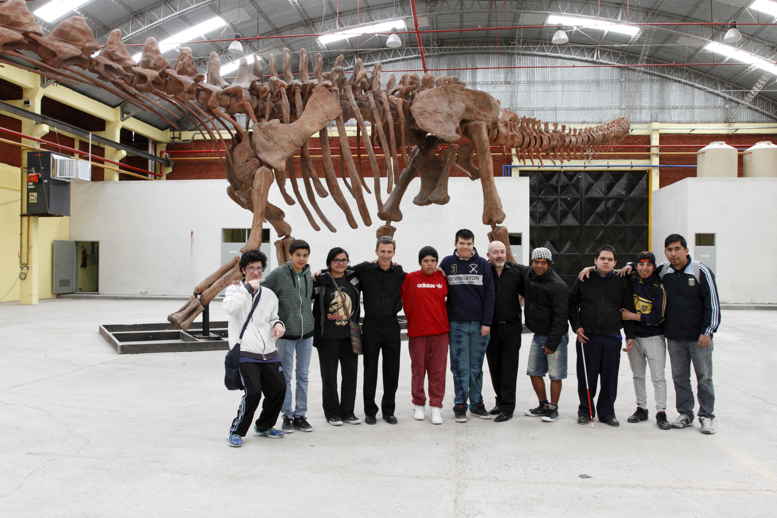 Chris Stock and Andy Everton with music students from Patagonia, in front of the reproduction dinosaur at the Predio Ferial, Trelew.