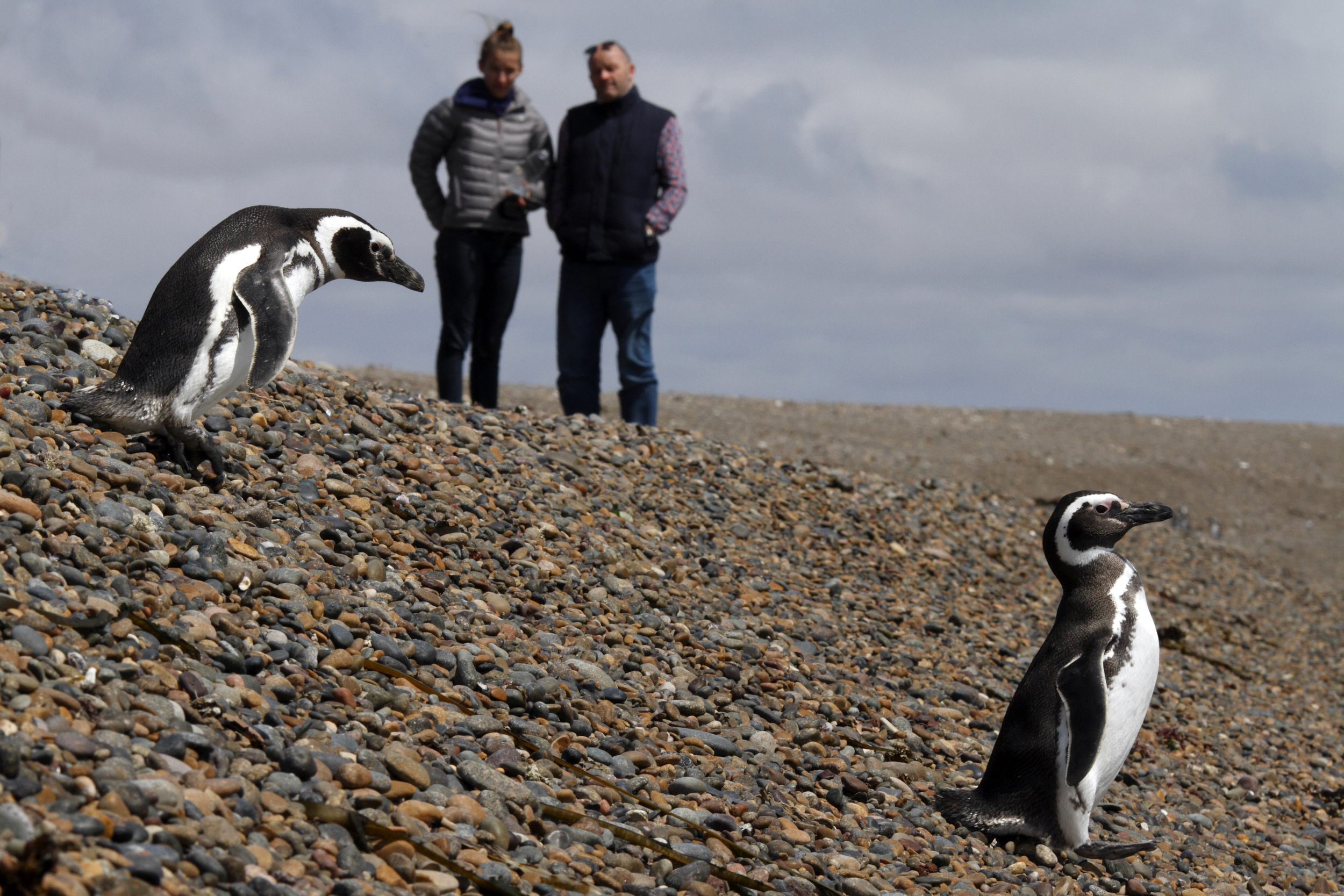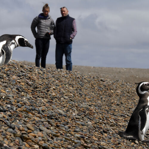 Nature tourists watching Magellanic Penguins at El Pedral, Chubut. Patagonia.