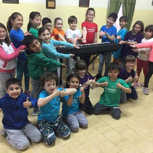 2019 - Delighted children with the schools new digital piano. Gaiman.