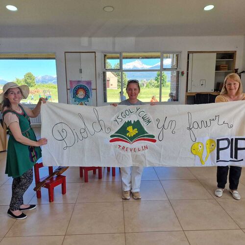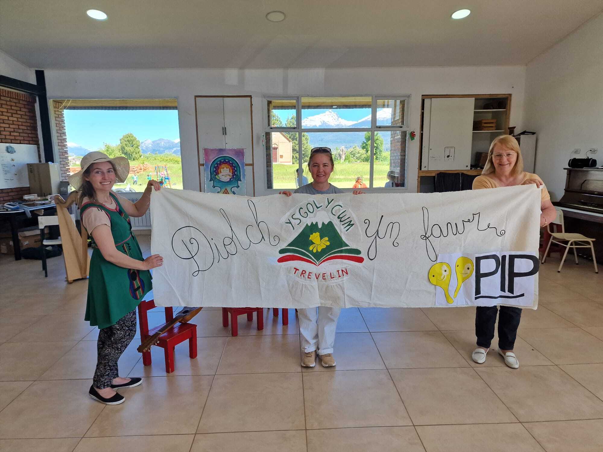 2023 - Thank you banner made by Ysgol Y Cwm in Trevelin after some more of our donations arrive with Angeles from Teithiau Patagonia
