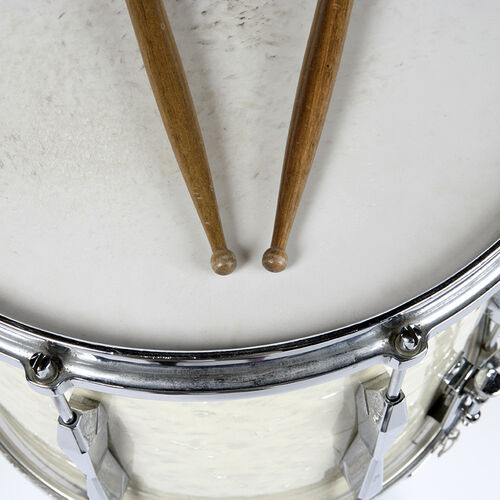 A marching snare drum with sticks