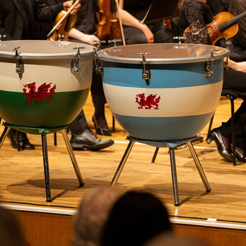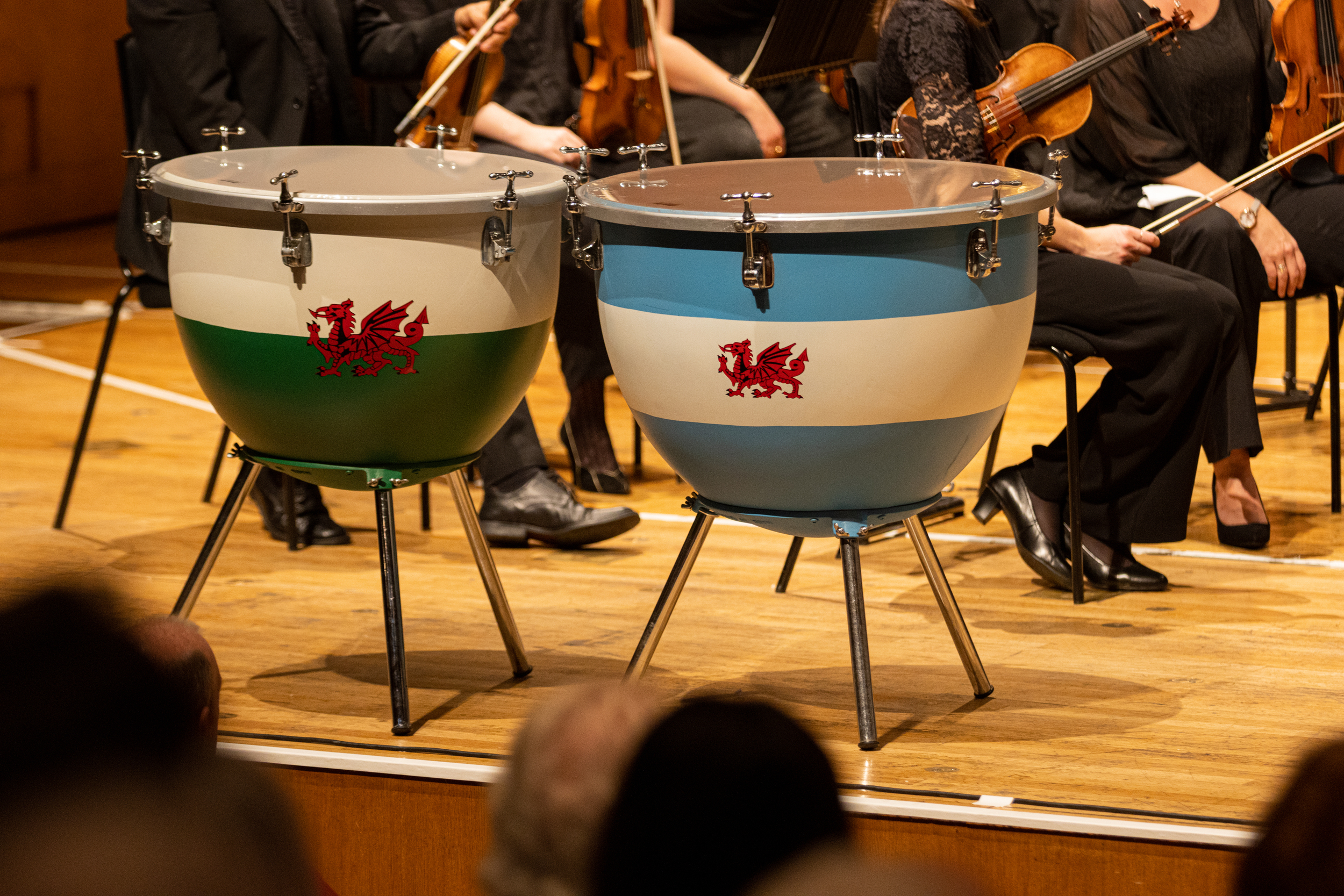 Two hand tuned Timpani painted in the flags of Wales and Welsh Patagonia, forming part of the intial drive to start up PIP, and used as an advertising tool to promote our charity. On stage at St David's Hall, Cardiff.