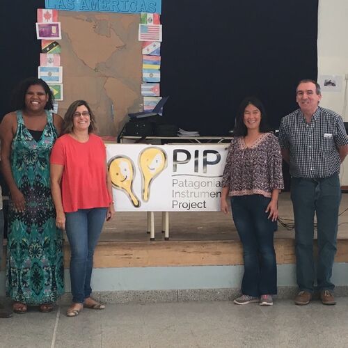 2018 - L-R Chris Stock (Chairman -PIP) Silvina Garzonio (Head of the Welsh Assocation in Puerto Madryn), Minister for Education in Chubut, Kenia Rodriguez (head of the Chorus and Orchestras part of the ministry), at the official signing of the necessary documents to accept our shipment of 10 flight cases full of instruments.